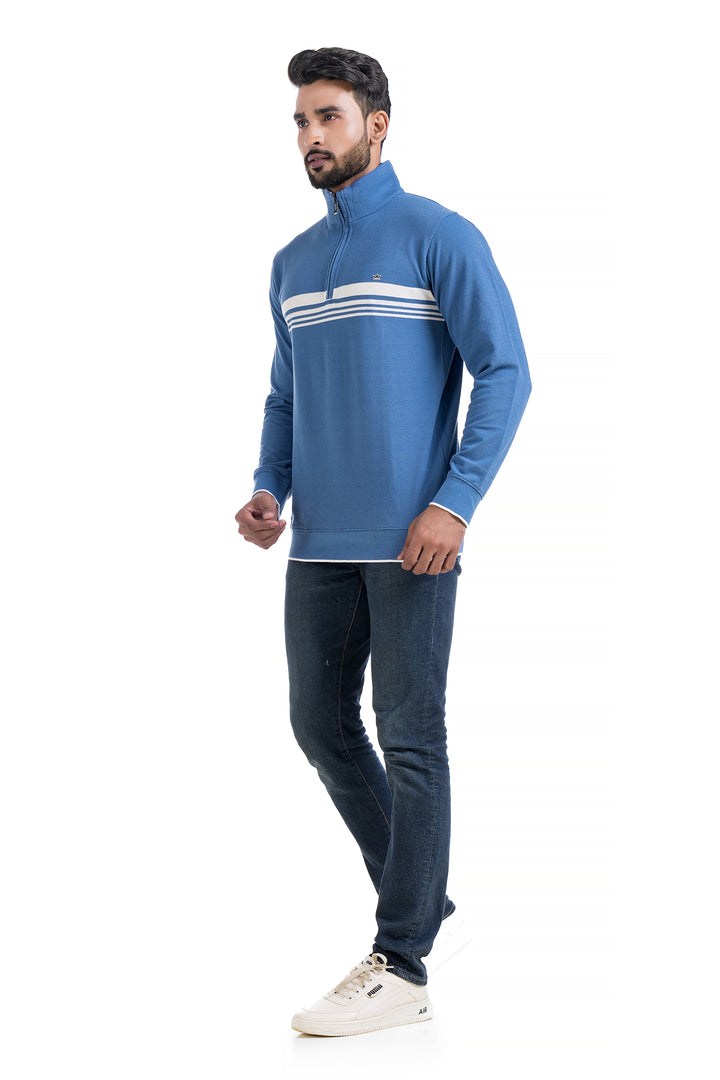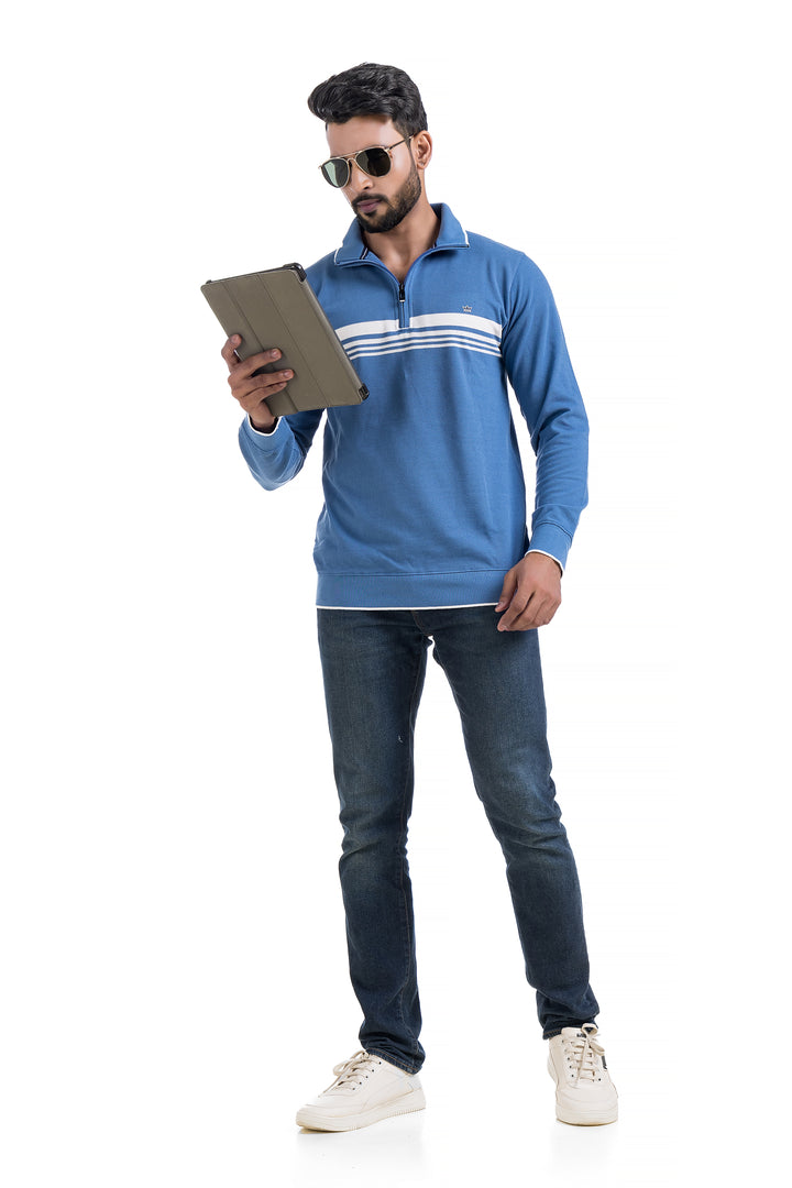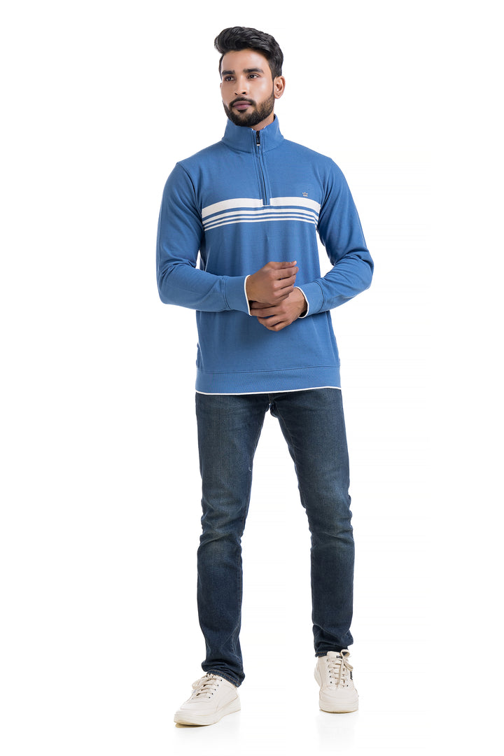 This lightweight sweater fabric with a soft brushed inside. Stand-up collar, zip at the top, long sleeves and ribbing at the cuffs and hem.